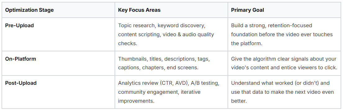 The algorithm today is incredibly smart. It looks at far more than just keywords, analyzing viewer signals and content quality in sophisticated ways. That means your optimization strategy needs to be just as smart. I've found it's best to break it down into three core stages.