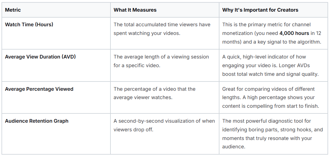 It's also crucial to remember that YouTube's algorithm looks at watch time differently depending on the format. For your standard long-form videos, both absolute watch time (total minutes watched) and relative retention (the percentage) are vital. A 15-minute video with 50% retention (7.5 minutes) is often seen as more valuable by the algorithm than a 3-minute video with 90% retention (2.7 minutes).